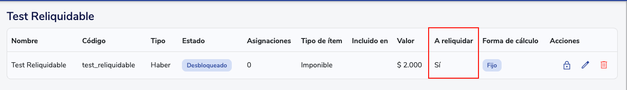 IMPORTANTE: Una vez creado un ítem A reliquidar y utilizado en una reliquidación, no puedes editar esta característica. Del mismo modo, si tienes un ítem que no tenga esta característica y ya lo has asignado anteriormente, no puedes convertirlo a un ítem A reliquidar.