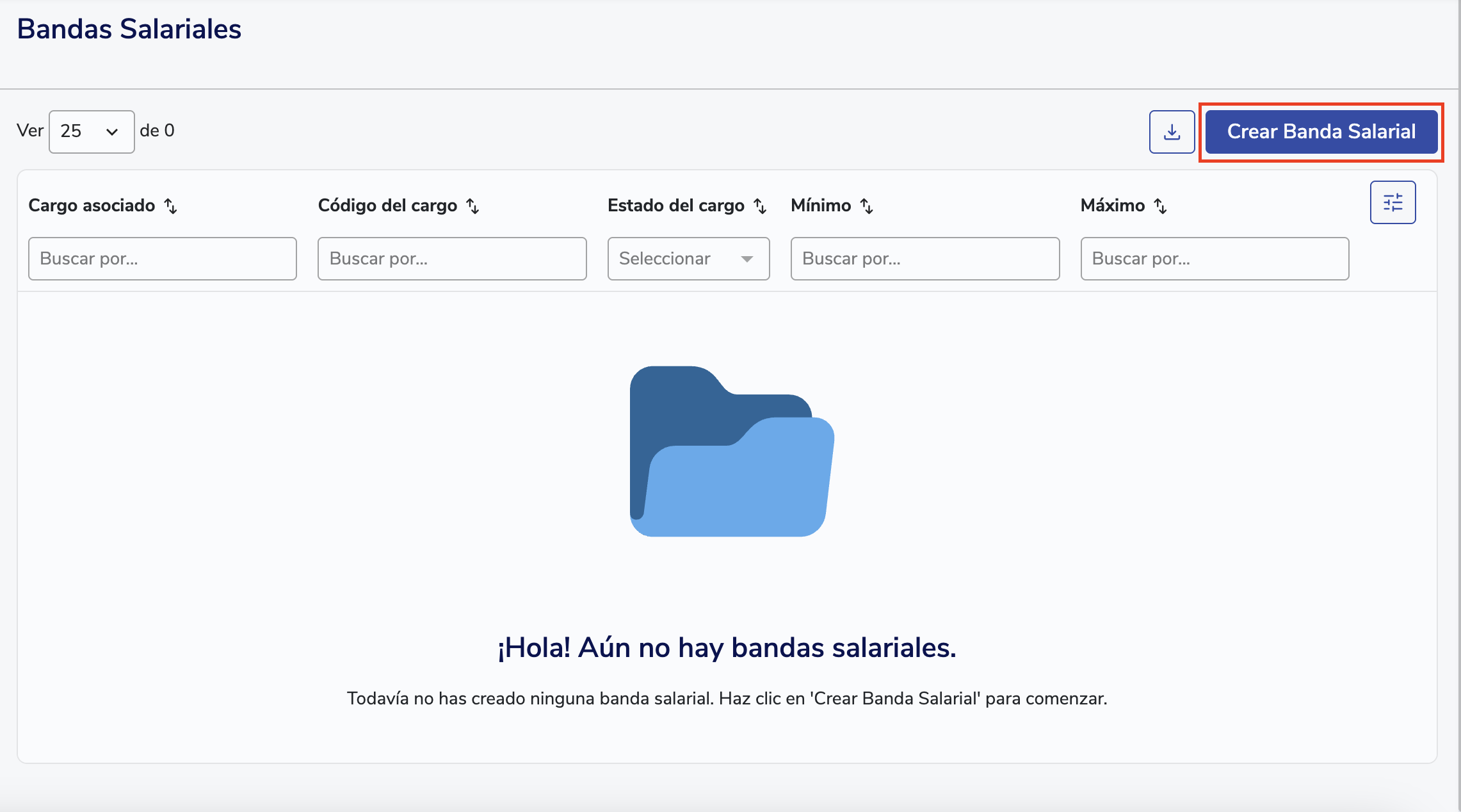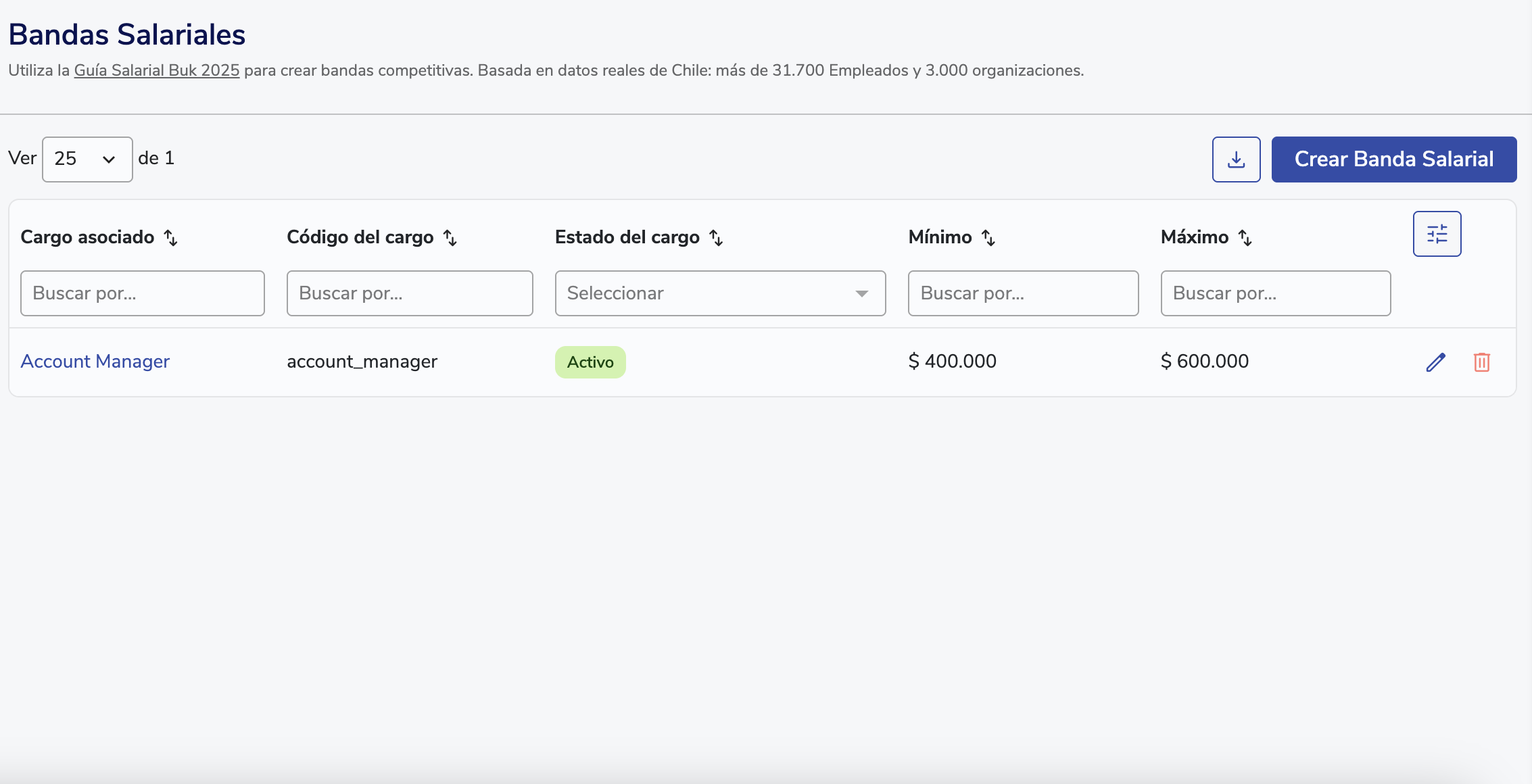 Al presionar “Guardar” tu banda salarial quedará guardada y visible en la tabla. En esta tabla podrás buscar por cargo, filtrar por el estado del cargo al que está asociada la banda y buscar por mínimo o máximo.