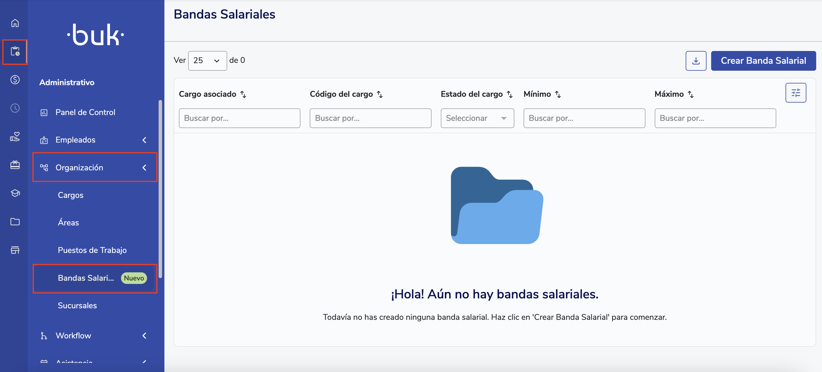 Si tu usuario ya cuenta con los permisos necesarios y quieres crear bandas salariales debes ingresar a Administrativo → Organización → Bandas Salariales. Aquí encontrarás la nueva sección de bandas salariales. En esta tabla encontrarás las bandas salariales creadas, por lo que en un inicio, estará vacía.