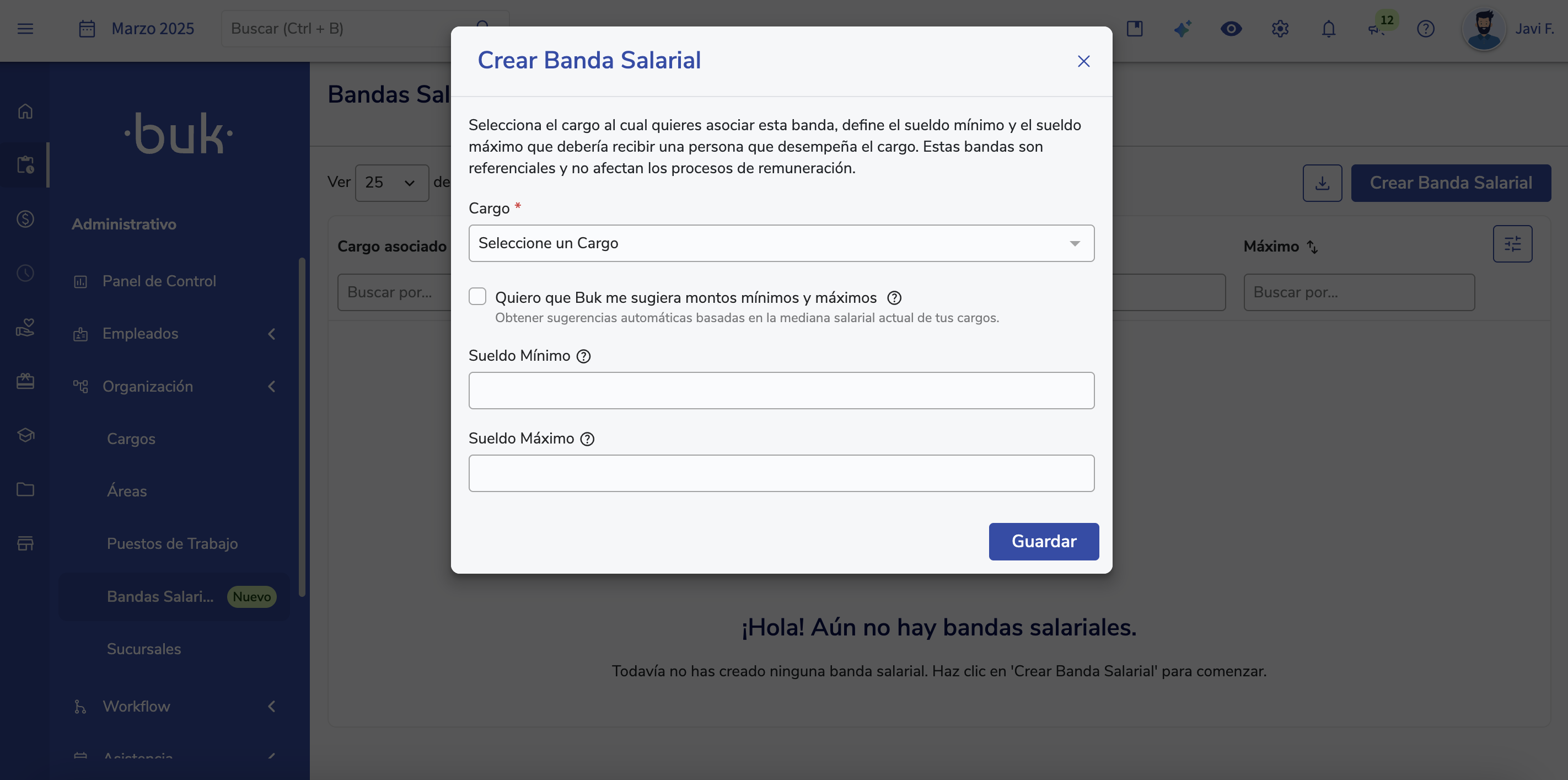- Máximo: ingresa el monto máximo de la banda salarial para ese cargo.
