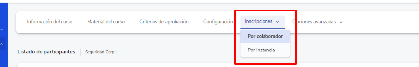 Gestionar participantes: Desde esta opción puedes inscribir usuarios por colaborador o por instancia