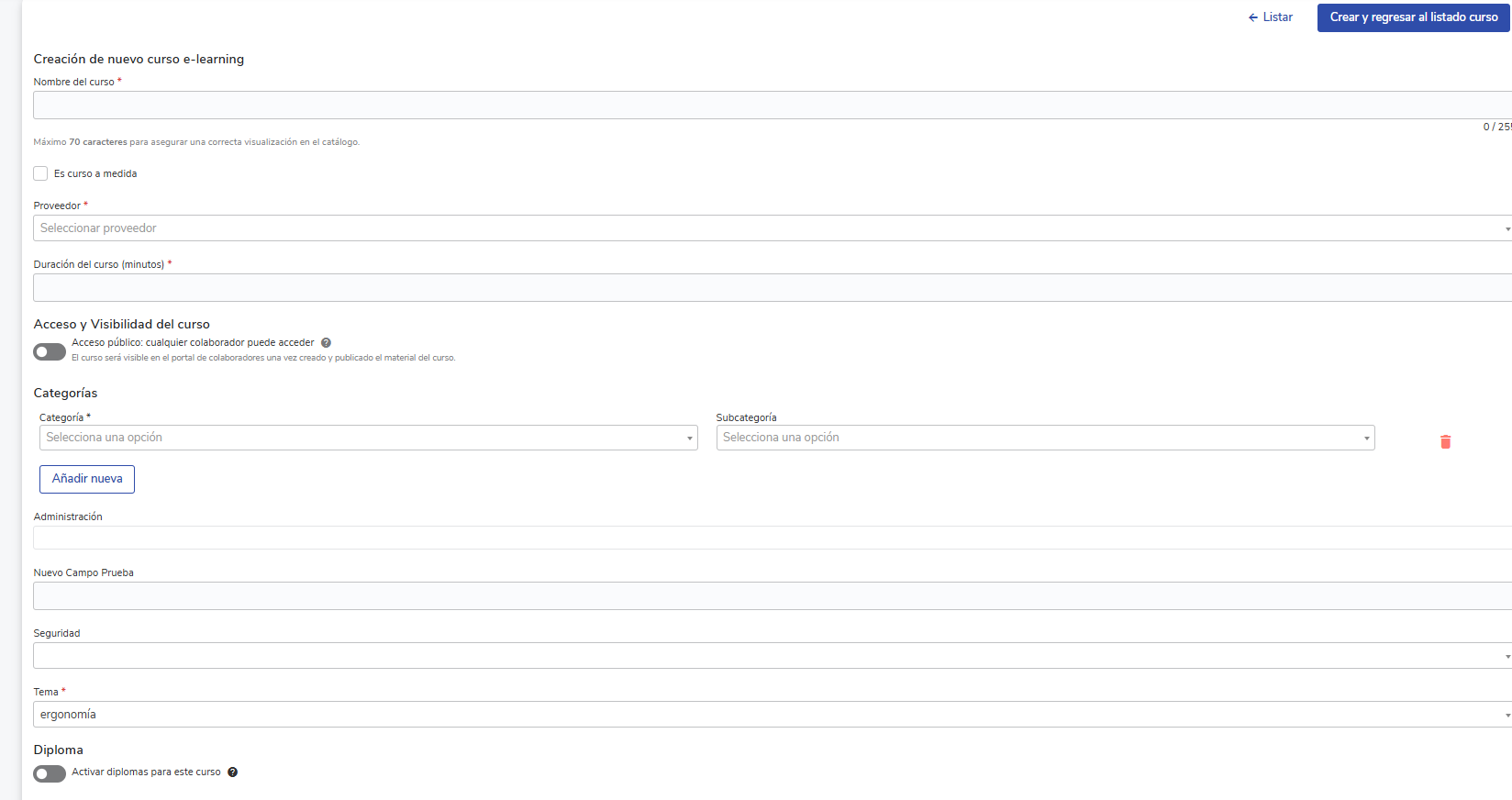 Una vez completado, haz clic en Crear y regresar al listado curso