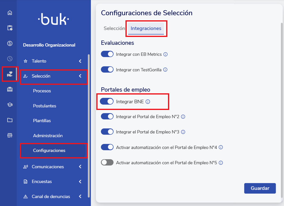 Para activar BNE en Buk se debe ingresar al módulo de Selección, luego a la sección de "Configuraciones" y a la pestaña de "integraciones". Acá debes activar el switch correspondiente y dar clic en “Guardar”.