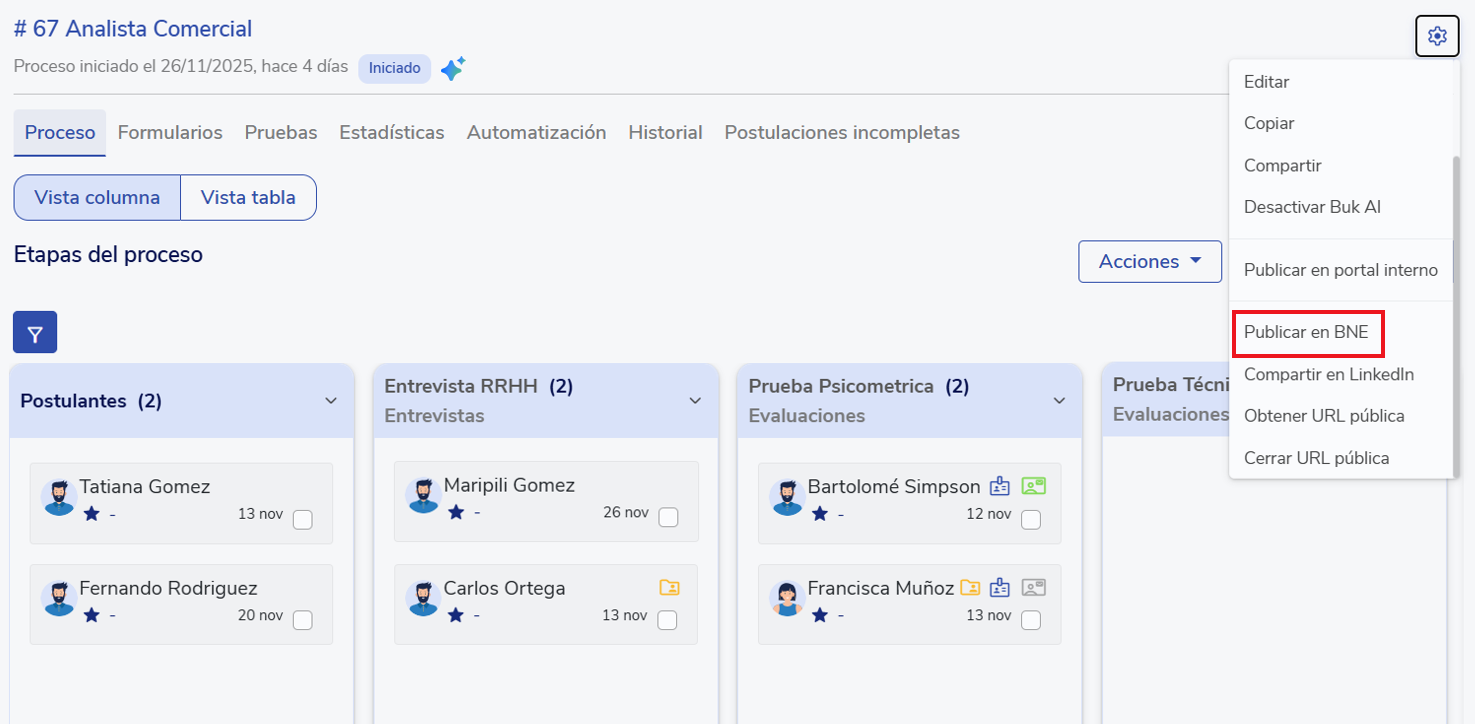 Con la integración activada, se habilitará la acción Publicar en BNE en cada uno de los procesos de selección activos.