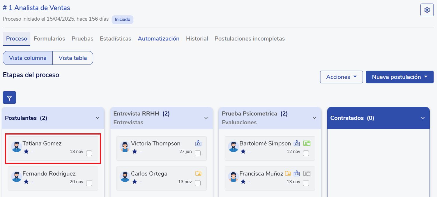 Una vez activada la integración, dirígete a la ficha del postulante. Puedes acceder a ella desde la vista de etapas de un proceso de selección. Para hacerlo, selecciona primero el proceso y luego al postulante. También tienes la opción de acceder a través del listado de postulantes en la sección de Selección, Postulantes.