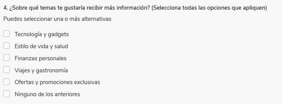 Permite seleccionar varias respuestas de un conjunto de alternativas.