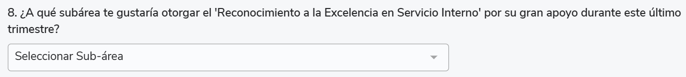 Los tipos de preguntas de Selección de empleados (7) y subáreas (8) permiten crear encuestas donde el encuestado pueda responder directamente un área y/o un colaborador.