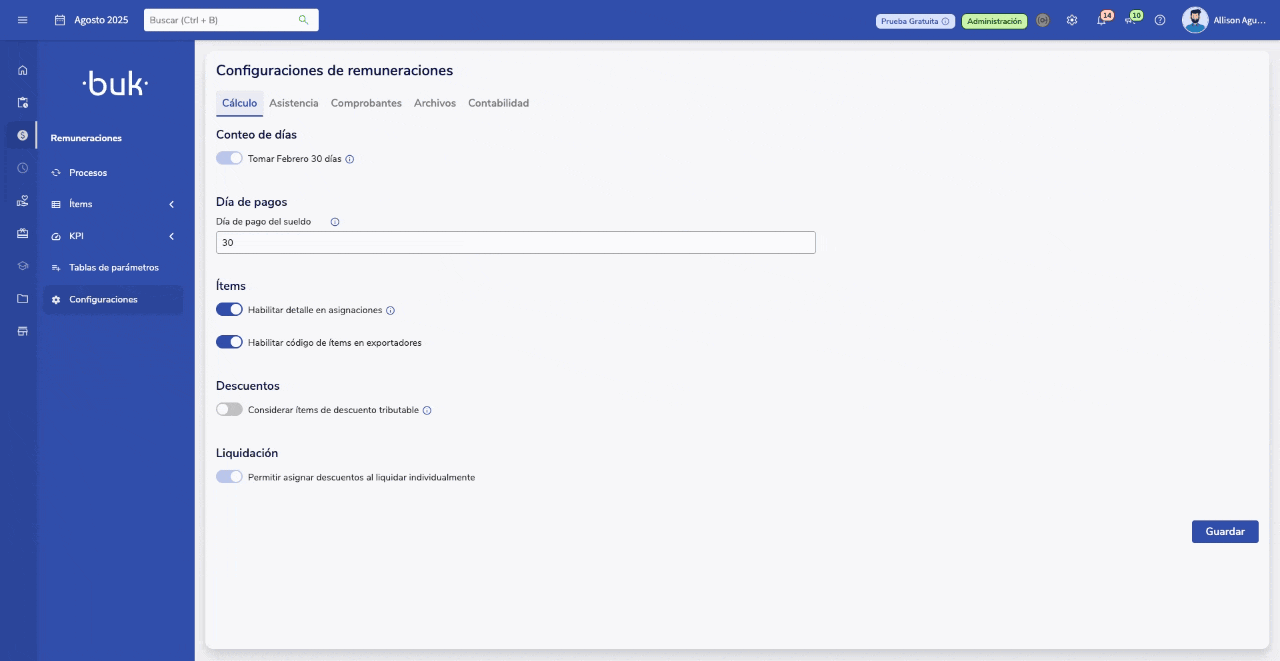 Asistencia: Podrás configurar como afectan ciertos factores de la asistencia a las remuneraciones, talos como, considerar el mes del goce vacacional para el cálculo del promedio variable de comisiones o no considerar la asignación familiar para el cálculo de la base de vacaciones, entre otros.