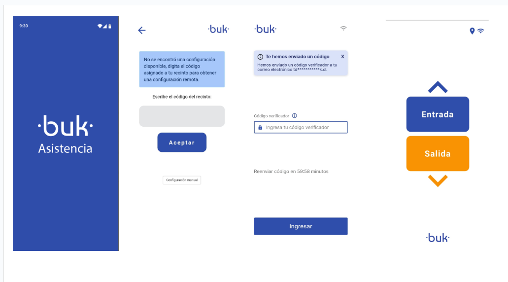 Para verificar tu acceso, enviamos un código de seguridad al correo registrado en Alertas y Notificaciones de tu configuración de recintos. Si gestionas estos ajustes desde Buk, revisa la pestaña Notificaciones para confirmar a qué correo llegará el código.
