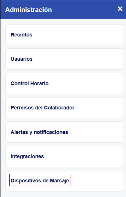 Como administrador del módulo de asistencia, tienes la opción de gestionar las aplicaciones móviles de marcación desde el botón "Administración"(engranaje)::Dispositivos de Marcaje.