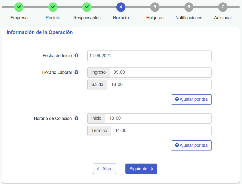Si el Horario Laboral tiene diferencias de horario durante la semana (por ejemplo, los viernes el horario de salida es más temprano que el resto de los días de la semana), se puede realizar una configuración por día haciendo clic en el botón "Ajustar por día".