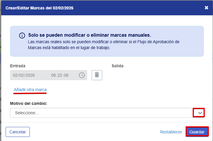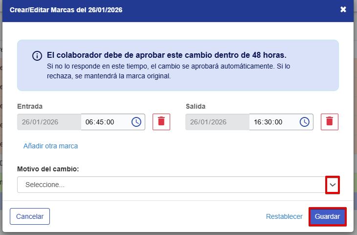 Aparecerá un cuadro donde debemos registrar la hora de la marca correspondiente dando clic en Añadir otra marca y eligiendo el motivo por el cual se está creando esa marca, finalmente clic en Guardar
