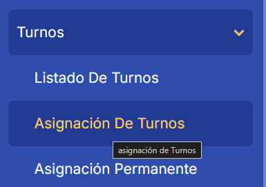 Para modificar turnos al pasado desde el calendario de turnos del módulo de Control de Asistencia, nos dirigimos al menú Turnos y a la opción Asignación de Turnos.