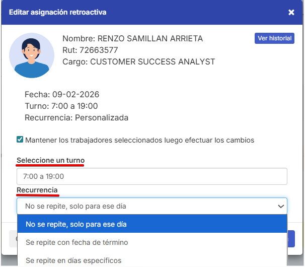 Además, tienes la opción de modificar los turnos pasados, estableciendo una recurrencia si fuera necesario.