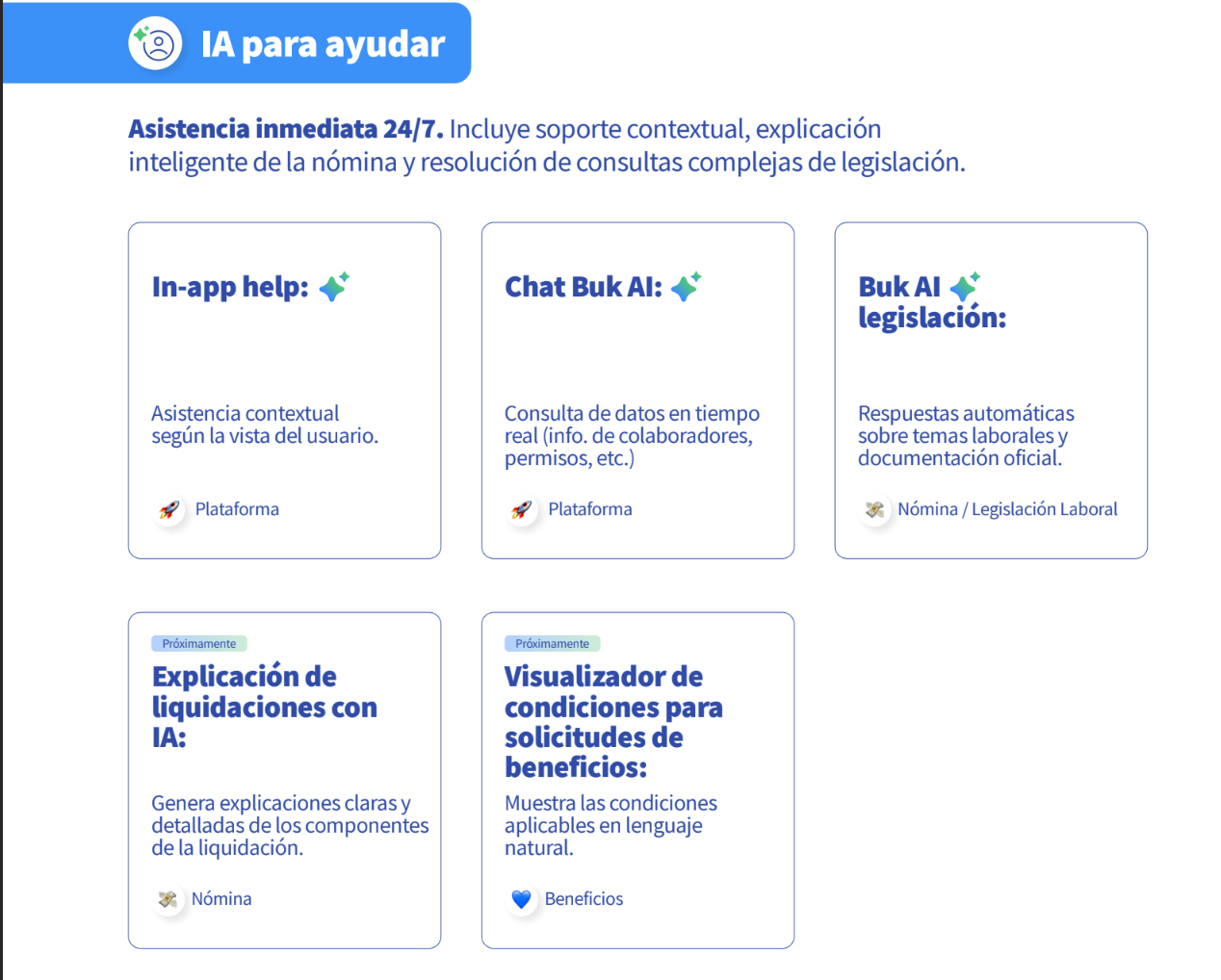 Buk AI es el motor de IA que optimiza las funcionalidades que ya utilizas en la plataforma, convirtiéndose en una aliada estratégica para la gestión de personas.