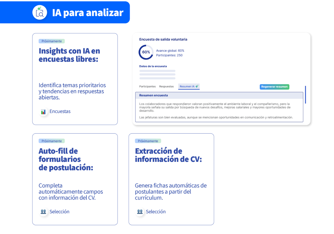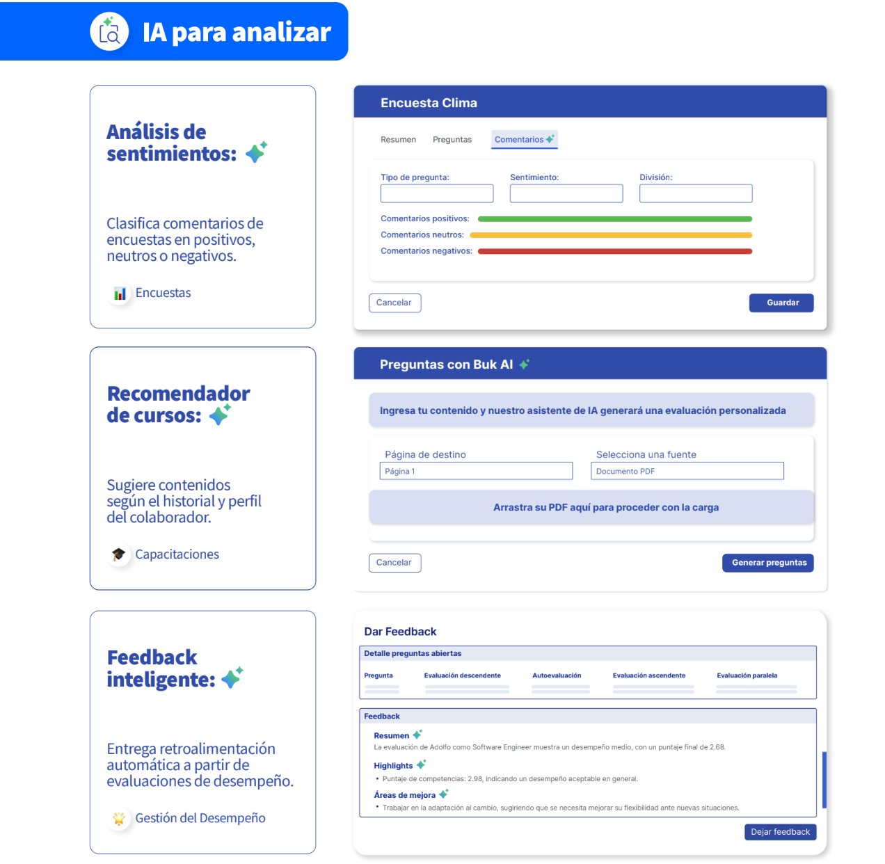 Buk AI potencia tu plataforma a través de tres áreas clave, transformando tareas operativas y entregando apoyo estratégico: