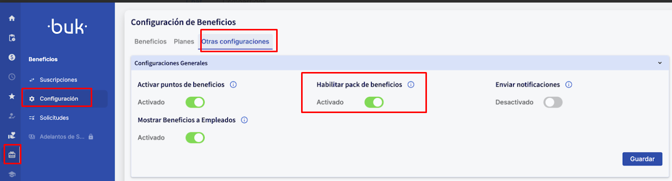 Cuando el cliente sí tiene activo el módulo de beneficios, en la misma barra lateral izquierda Beneficios, en la opción Configuración>>Otras Configuraciones podrá activar/desactivar el pack de beneficios en la opción “Habilitar pack de Beneficios”.