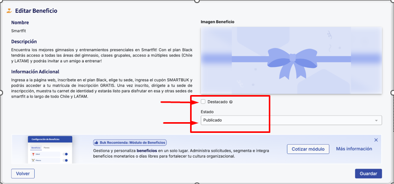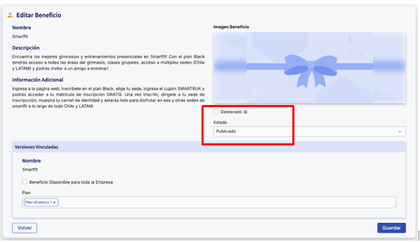 - Editar el estado de cada beneficio: Cambia el estado de cada beneficio: "Publicado" lo hará visible para tus colaboradores, mientras que "Borrador" lo ocultará.