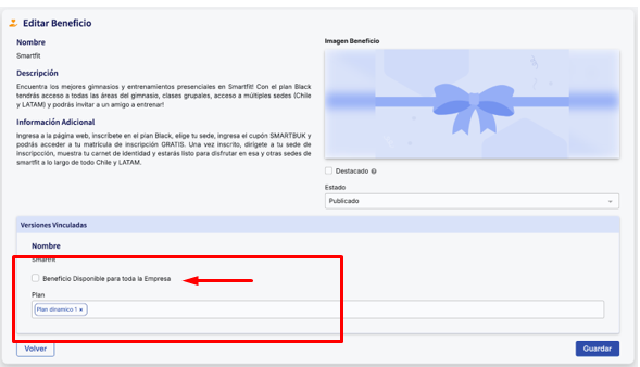 - Segmentar si el beneficio es disponible para toda la empresa y asignar Planes (exclusivo para quienes tengan el módulo contratado)