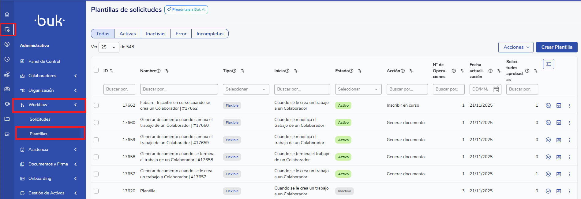 La vista de Plantillas es el lugar donde administras toda la configuración de los procesos (workflows) que estarán disponibles en tu plataforma. Desde aquí puedes crear nuevas plantillas, editar las existentes, duplicarlas, activarlas o desactivarlas, y revisar posibles errores o advertencias de configuración.