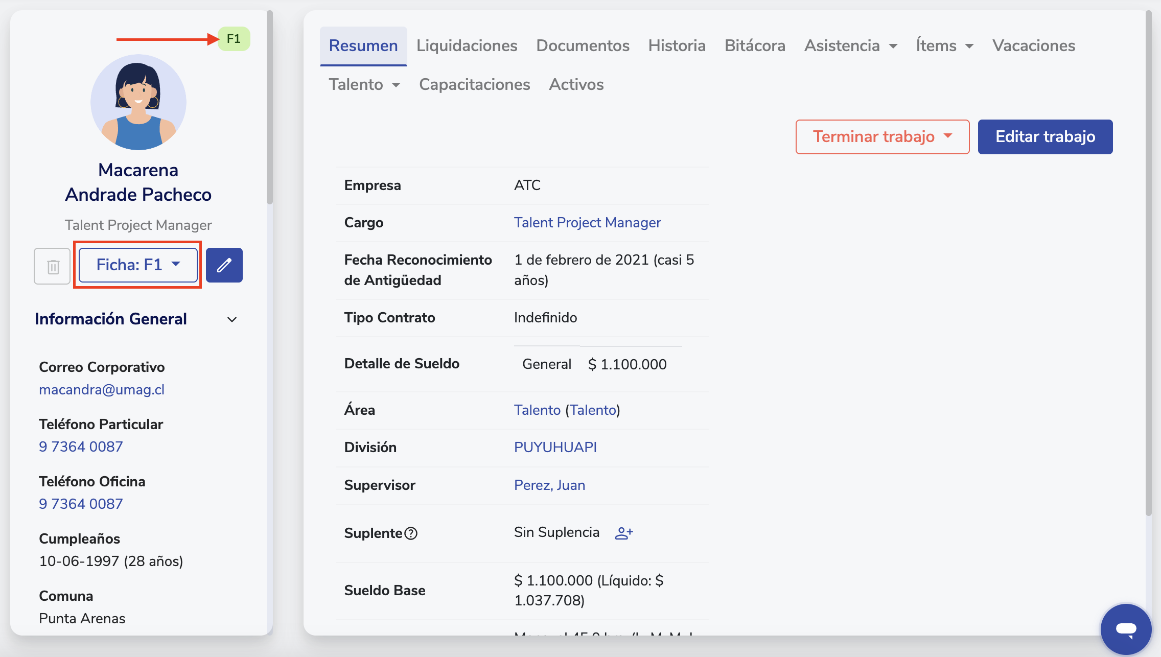 En la parte superior de la ficha podrás ver el código identificador de ficha. Buk por defecto le pone F1 a la primera ficha del colaborador al momento de crearlo, pero puedes elegir otro código al momento de crear al colaborador.