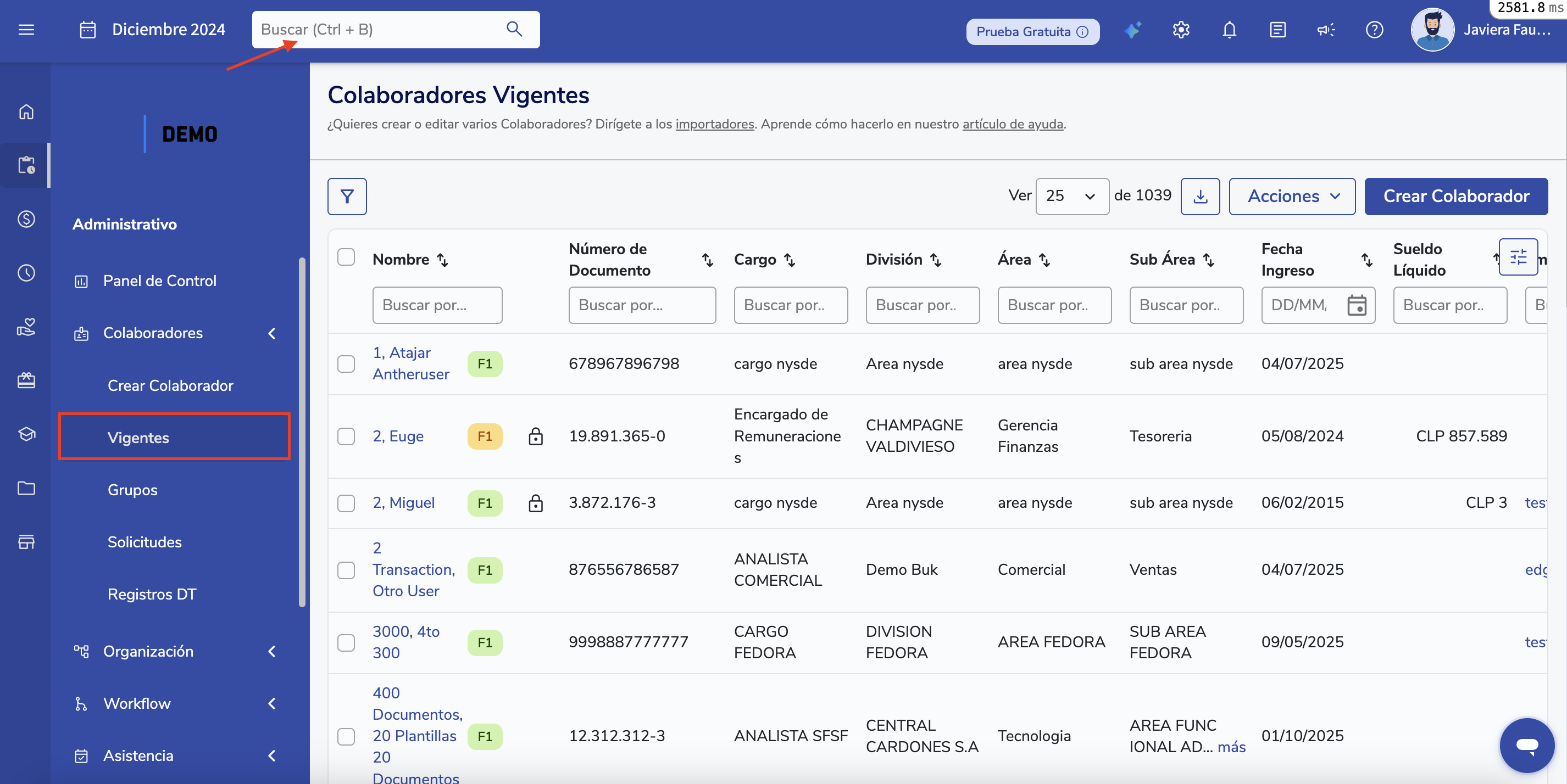 Para acceder a la ficha de un colaborador puedes hacerlo accediendo a "Administrativo" > "Colaboradores" > "Vigentes y buscando el nombre del colaborador al que quieres buscar, o bien, usando el buscador de la parte superior de la plataforma.