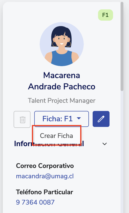 Además, abajo del nombre del colaborador, existe un selector de ficha donde podrás tanto navegar entre ellas, si es que el colaborador seleccionado tiene más de una, como crear otra ficha.
