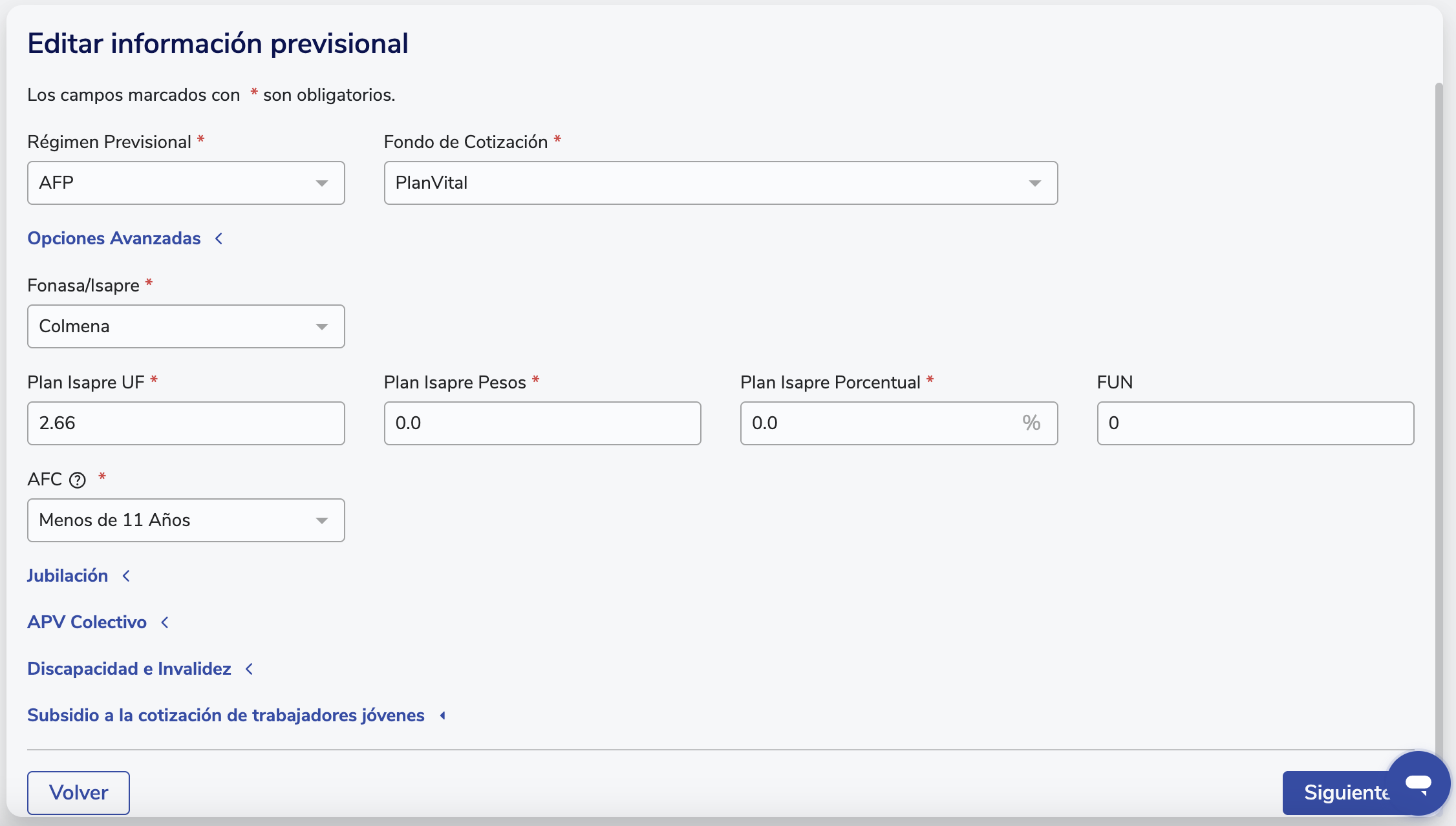 Deberás rellenar todos los datos de trabajo como especificar ingreso a la compañía, reconocimiento de antigüedad, etc. Al hacer clic en siguiente, deberás especificar los datos previsionales. Por defecto vienen cargados los datos de la ficha original, pero puede editarlo si lo necesitas.