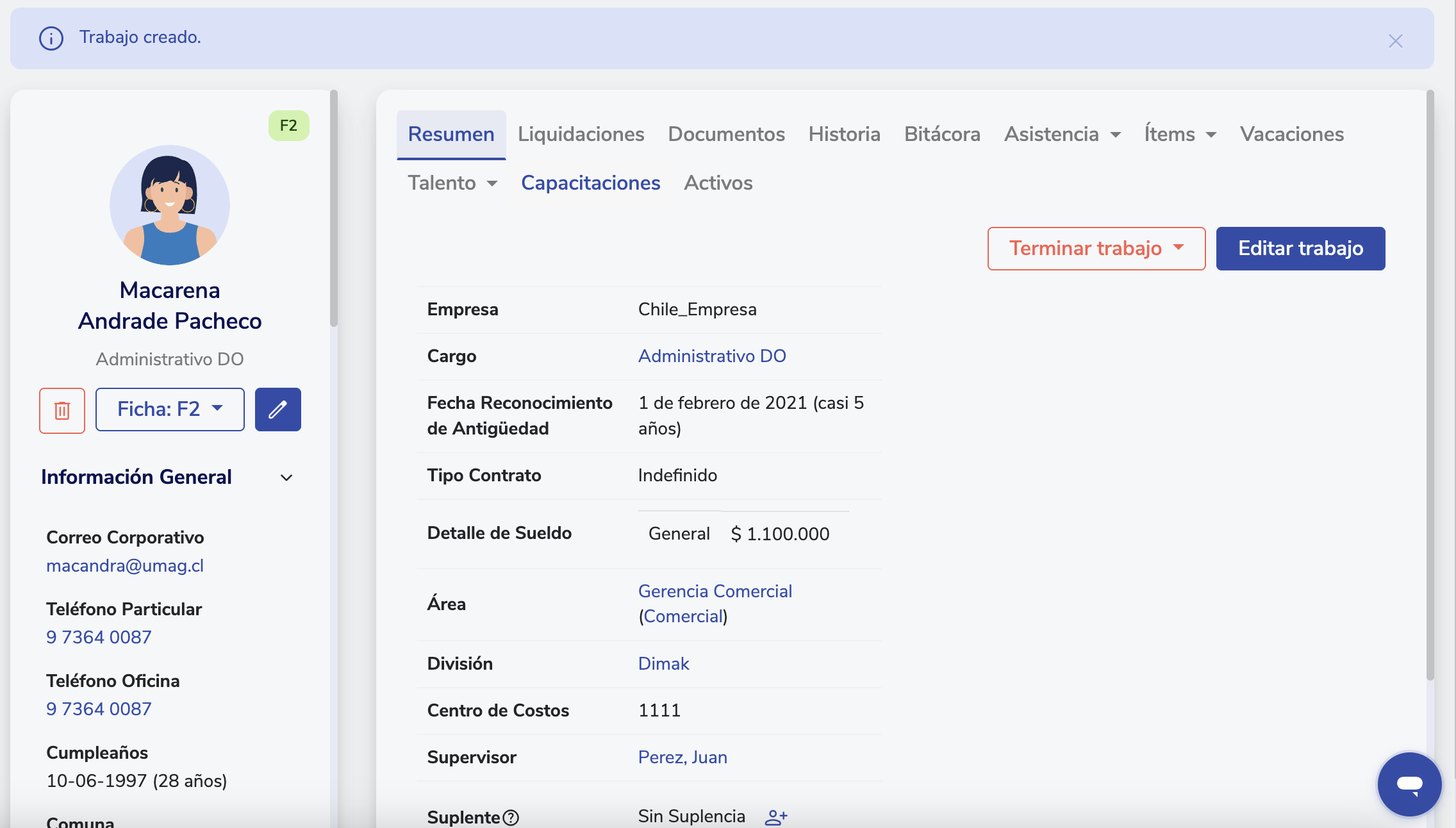 Una vez dentro de la ficha verás un resumen de los datos personales y del trabajo del colaborador. Además, podrás ver información específica de ese colaborador de liquidaciones o nóminas, documentos, bitácora, etc.