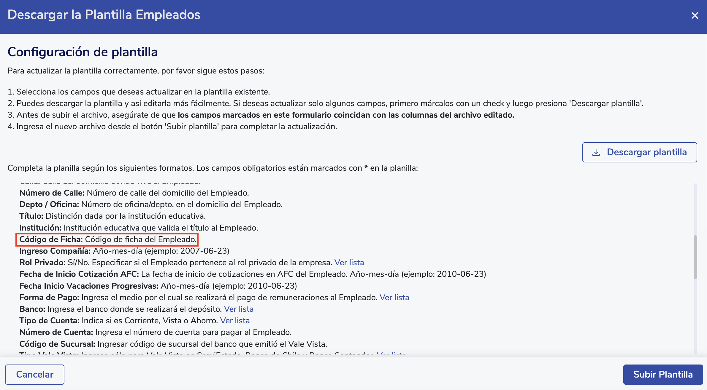 En general importadores y modificadores que modifican datos de colaboradores siempre requieren especificar el código de ficha, te recomendamos siempre descargar el template, para que así tengas la versión soportada por la plataforma.