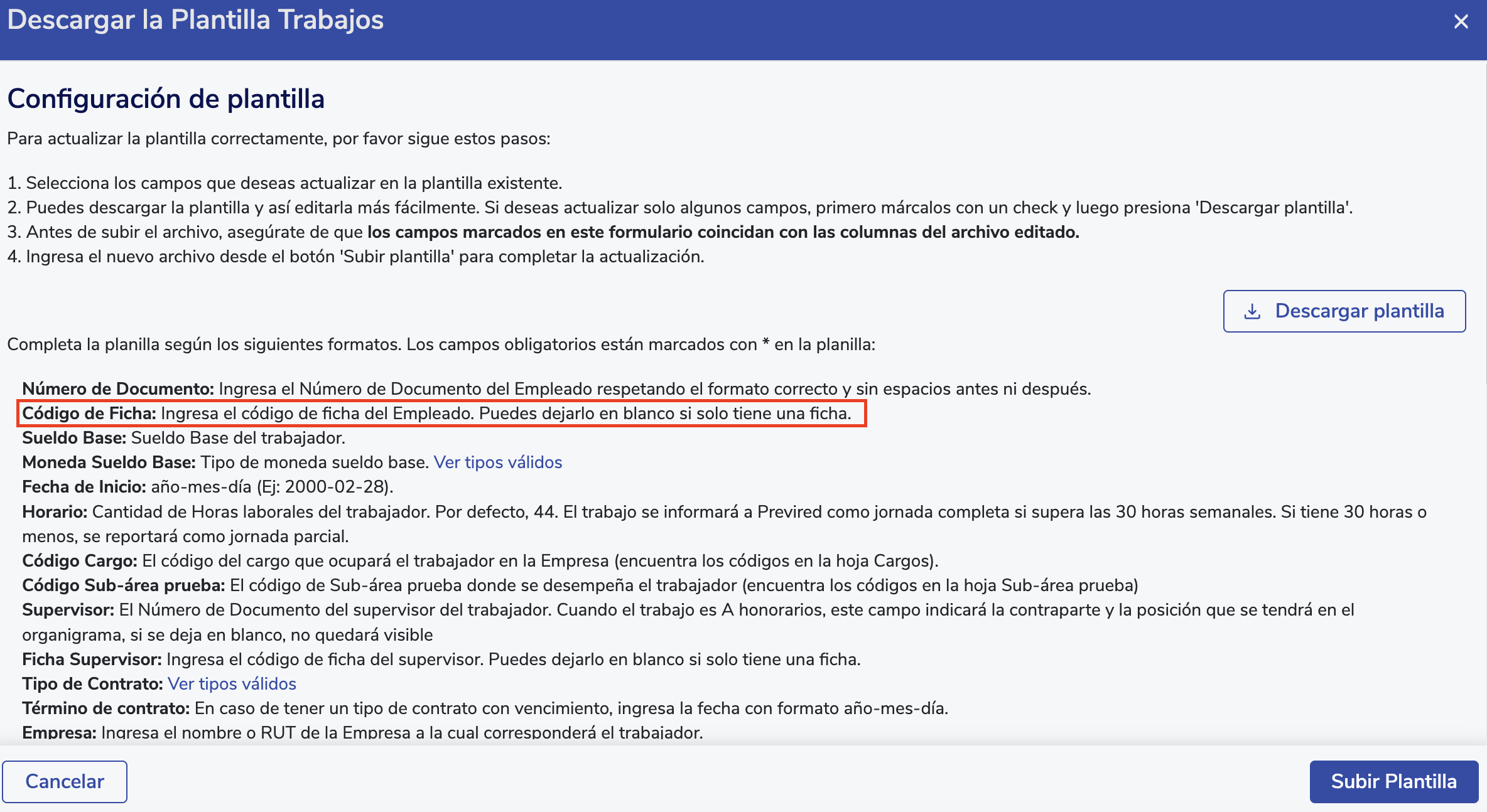 Al llenar la plantilla con los datos del importador y modificador de trabajos debes indicar cuál es el código de ficha del colaborador al que le estás creando o modificando el trabajo.