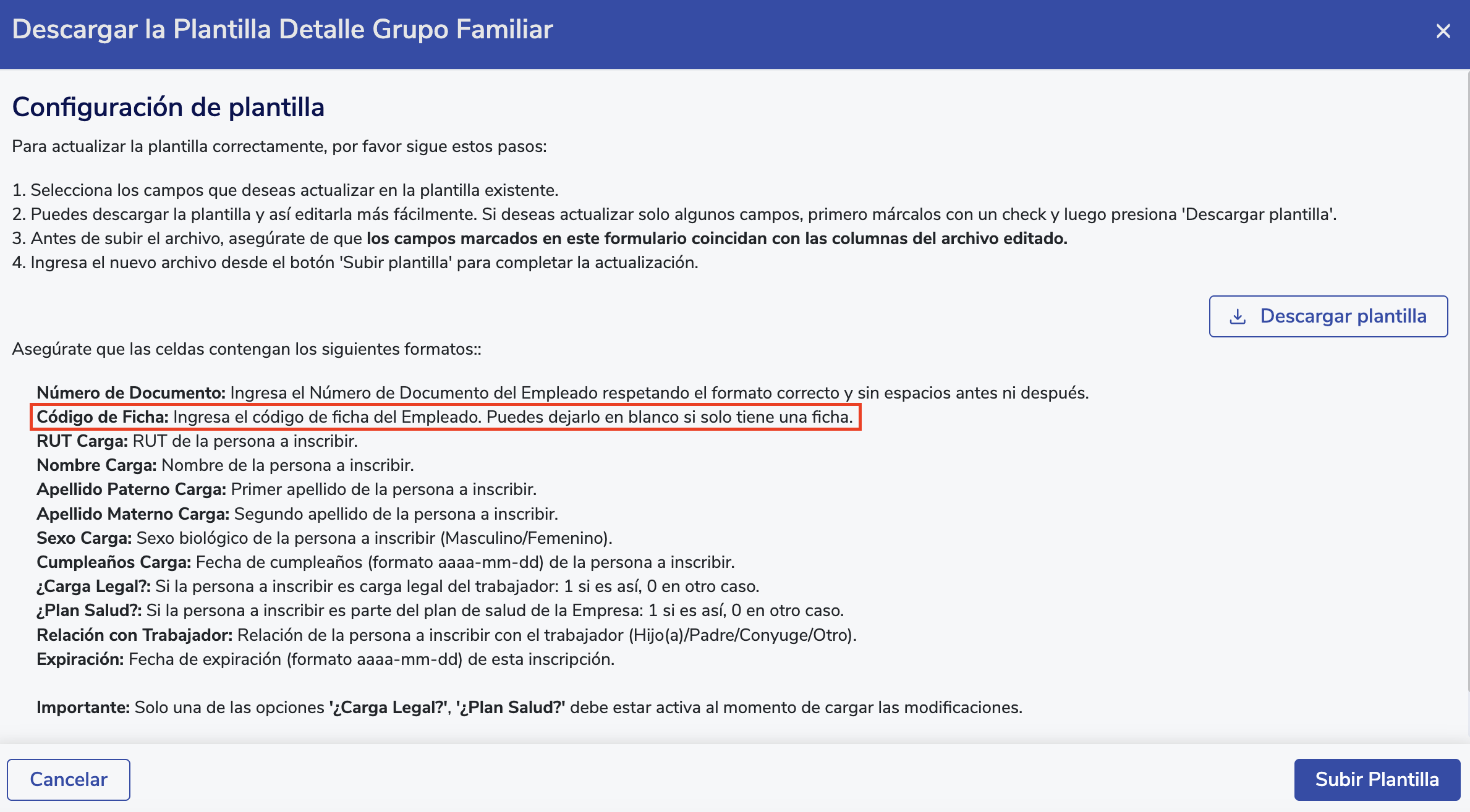 Al llenar la plantilla con los datos del importador y modificador de detalle grupo familiar debes indicar cuál es el código de ficha del colaborador al que le estás creando o modificando el trabajo.