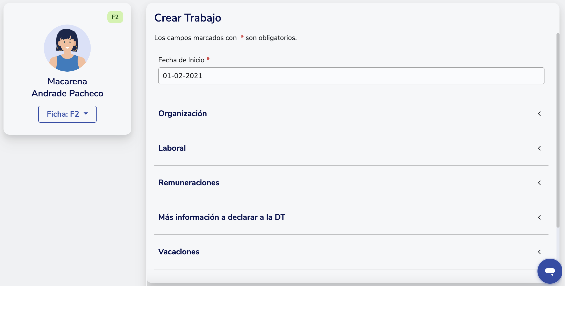 Finalmente, deberás completar los datos de trabajo de la nueva ficha que se está creando. Especificando fecha de inicio del trabajo, datos de la organización del nuevo trabajo, información laboral, de remuneraciones, etc.