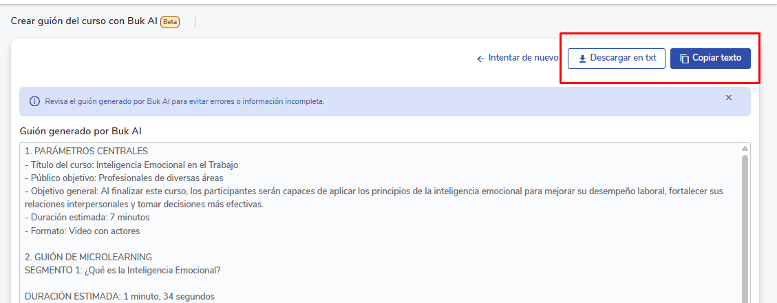 Buk AI te ayuda a convertir tus ideas y materiales en un guión instruccional completo, claro y listo para avanzar a producción.