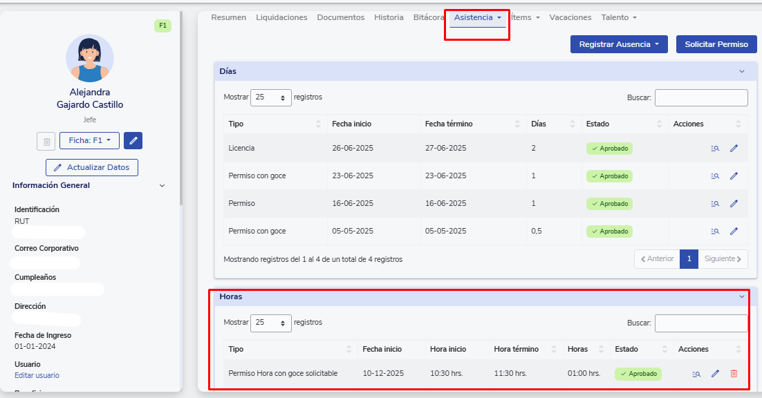Una vez que el beneficio integrado con permisos sea aprobado (mediante el flujo de aprobación de jefatura, RRHH, ambos o ninguno, según la configuración), el colaborador podrá visualizarlo en su ficha, en la sección "Asistencia > Ausencias".