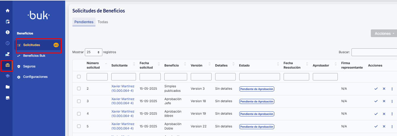 Por otro lado el Administrador de beneficios podrá visualizar las solicitudes que tiene pendientes de aprobar en la opción Beneficios >> Solicitudes, opción solo visible para usuarios con permisos de aprobación de beneficios: