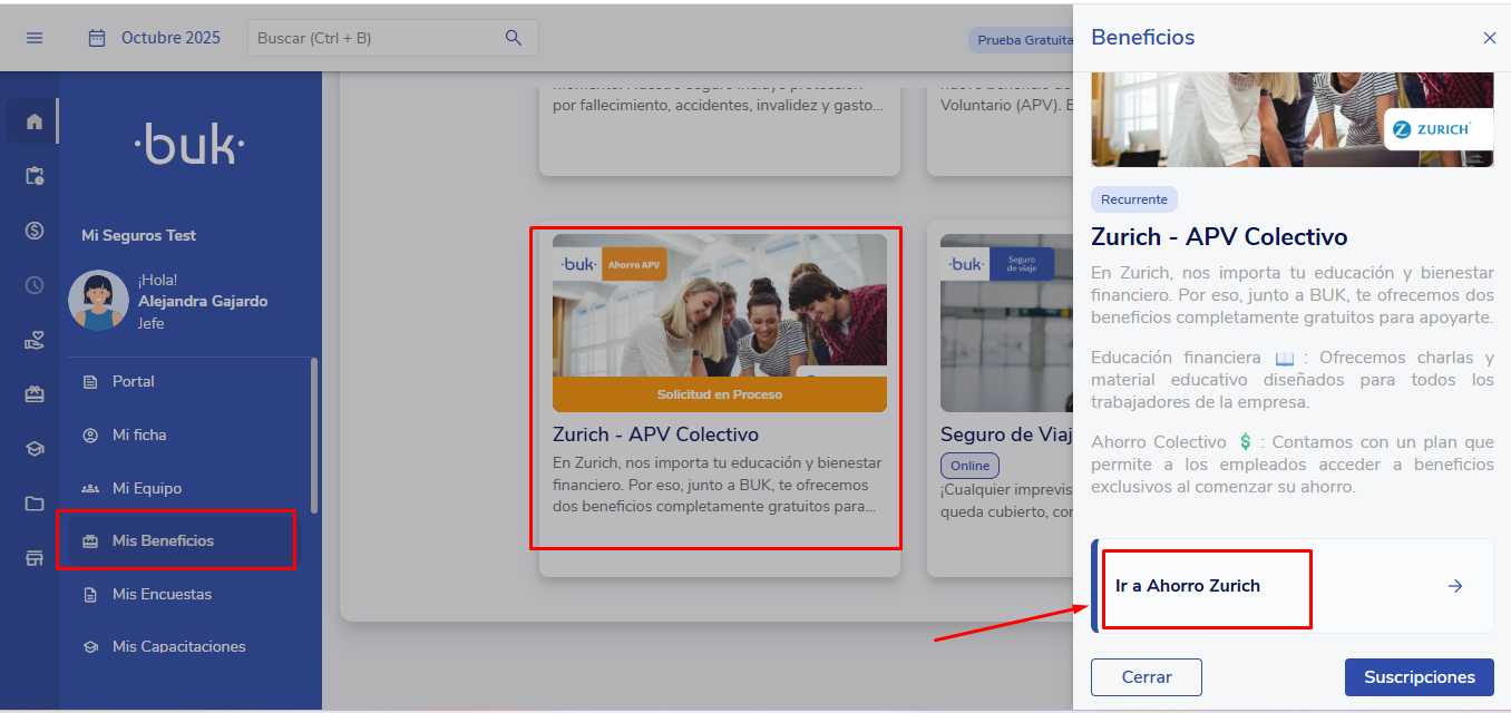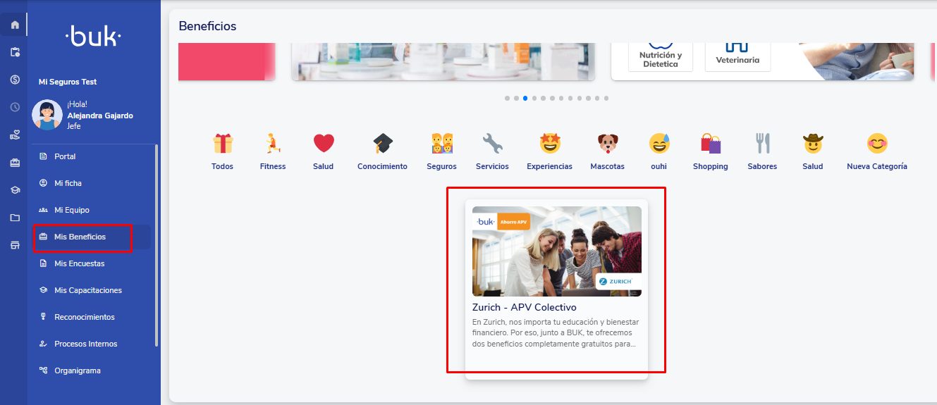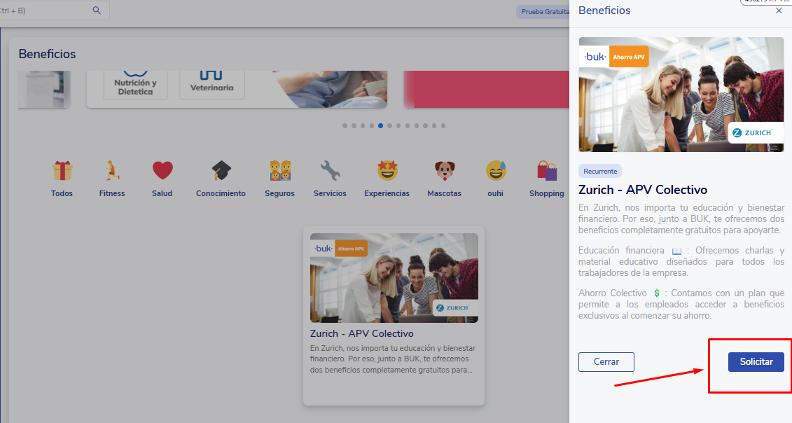 El Colaborador podrá acceder directamente a Beneficios en donde podrá seleccionar la opción APV Zurich y solicitar.