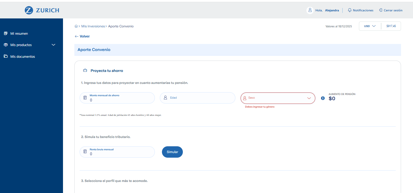 Una vez aprobada tu solicitud (confirmada vía correo) ingresa nuevamente desde Beneficios>> Zurich-APV Colectivo>> Ir a Ahorro Zurich y completa los datos de tu APV.