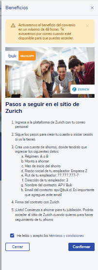 -Si seleccionas descuento por liquidación, Zurich notificará a BUK quien generará un cobro de APV en tu liquidación, que se aplicará a partir de la liquidación del mes siguiente.