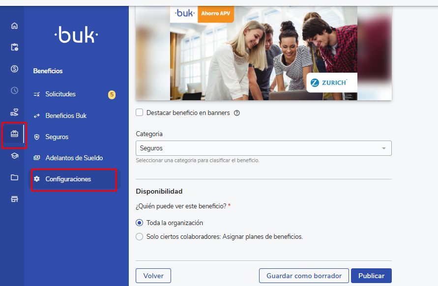 - Configurar la visibilidad del beneficio APV Zurich para tus colaboradores.