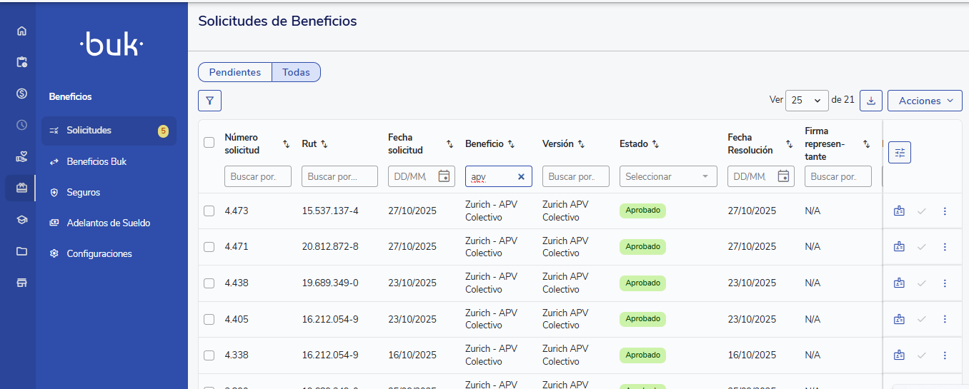 Además podrás ver quienes se encuentran en proceso de contratación del APV desde el apartado Beneficios>>Solicitudes de Beneficios.