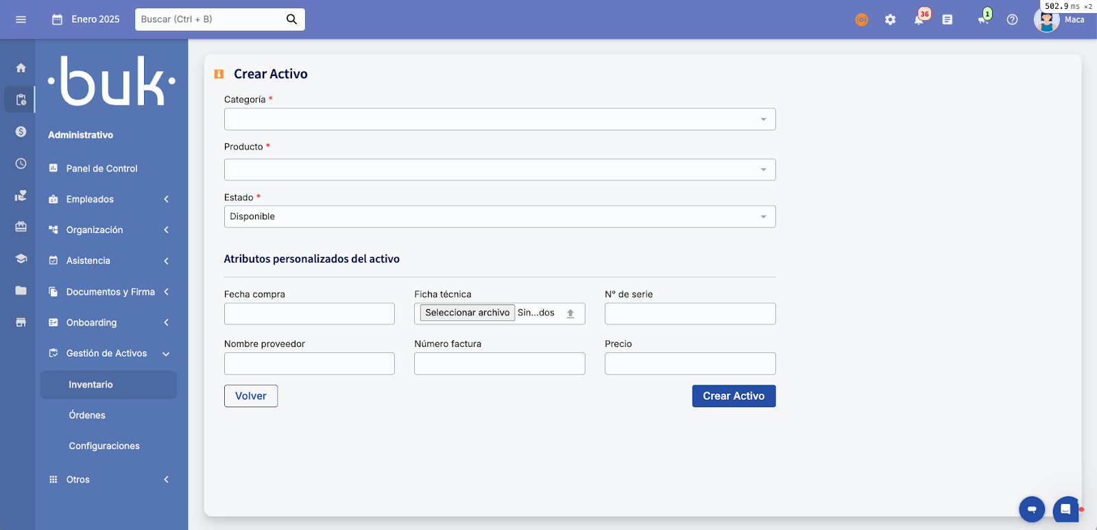 En caso de haber creado atributos personalizados para activos, deberás rellenar también esos campos.