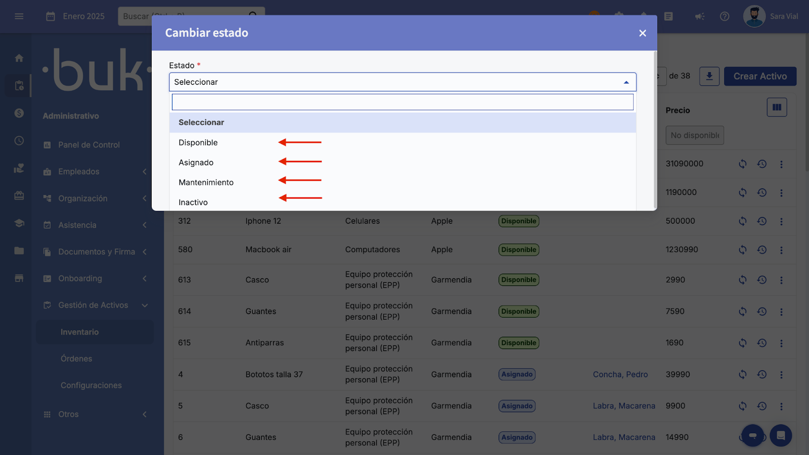 - Asignado: Estado cuando un activo está asignado a un colaborador. (no disponible para asignar). Para seleccionar este estado, te preguntará a quién deseas asignarlo y quedará como responsable del activo.