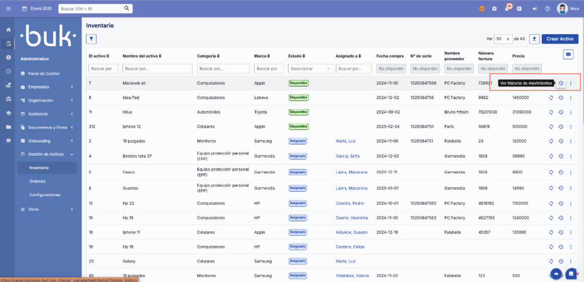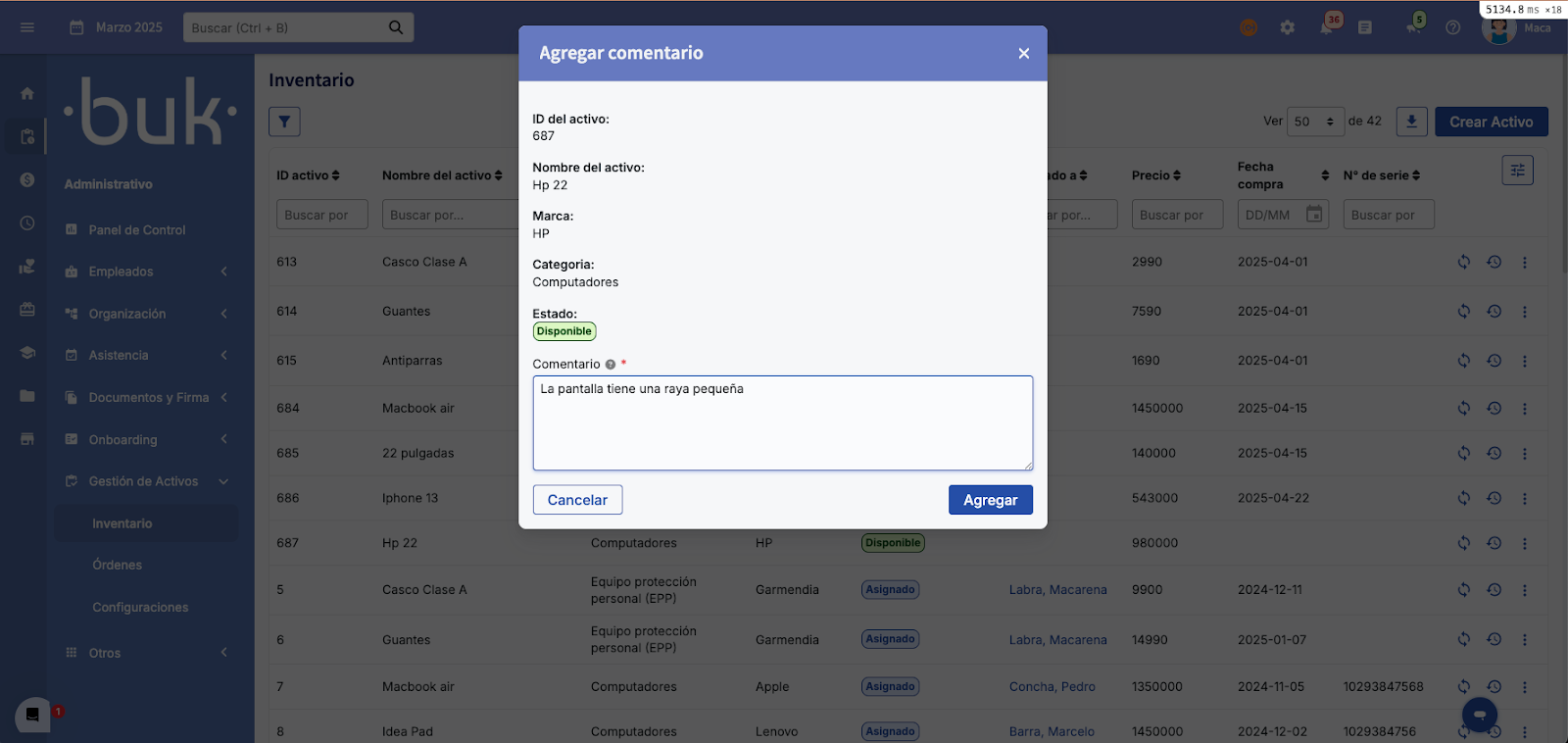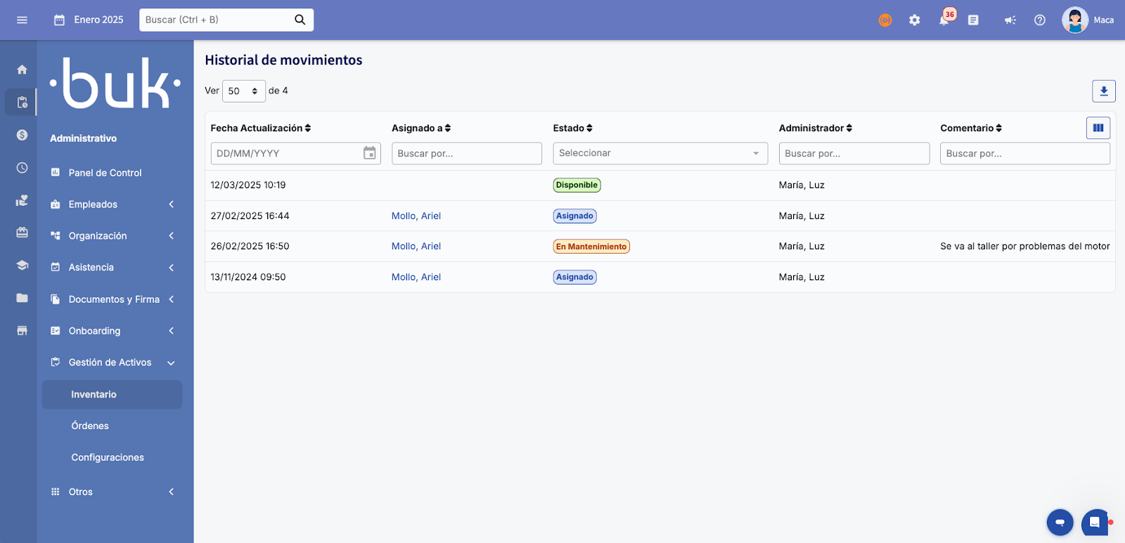Cada cambio que hagas —como reasignaciones, mantenimientos o bajas— queda registrado automáticamente en el historial. Esto asegura trazabilidad completa, con comentarios y fechas para auditar cualquier movimiento.