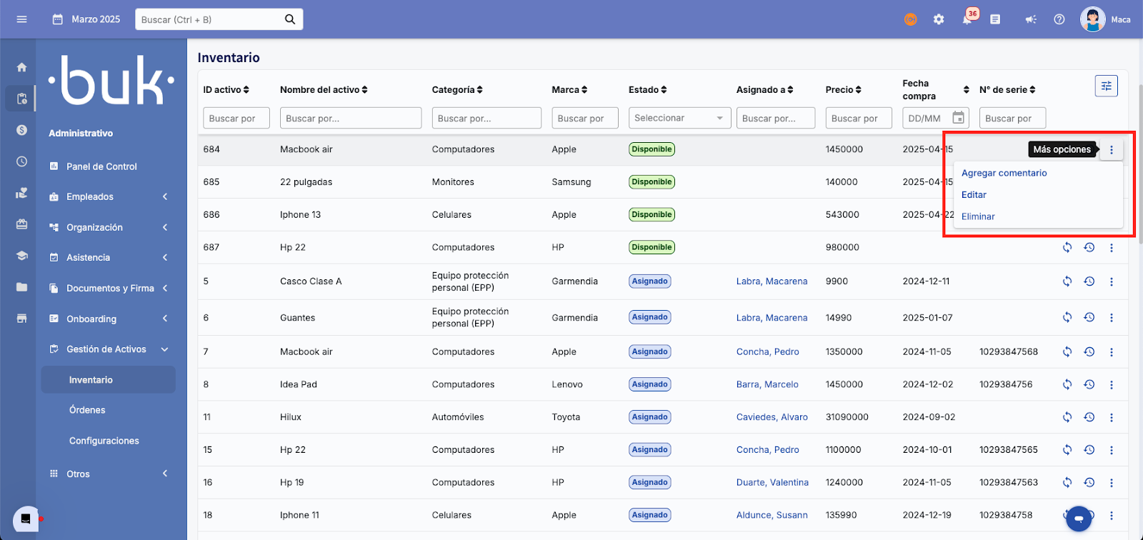 - Disponible: Estado cuando el activo está disponible para ser asignado a un colaborador