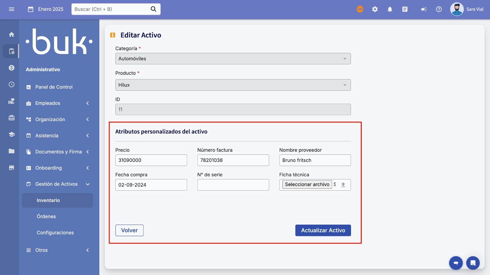 - Podrás editar sólo los atributos personalizados que creaste para ese activo.