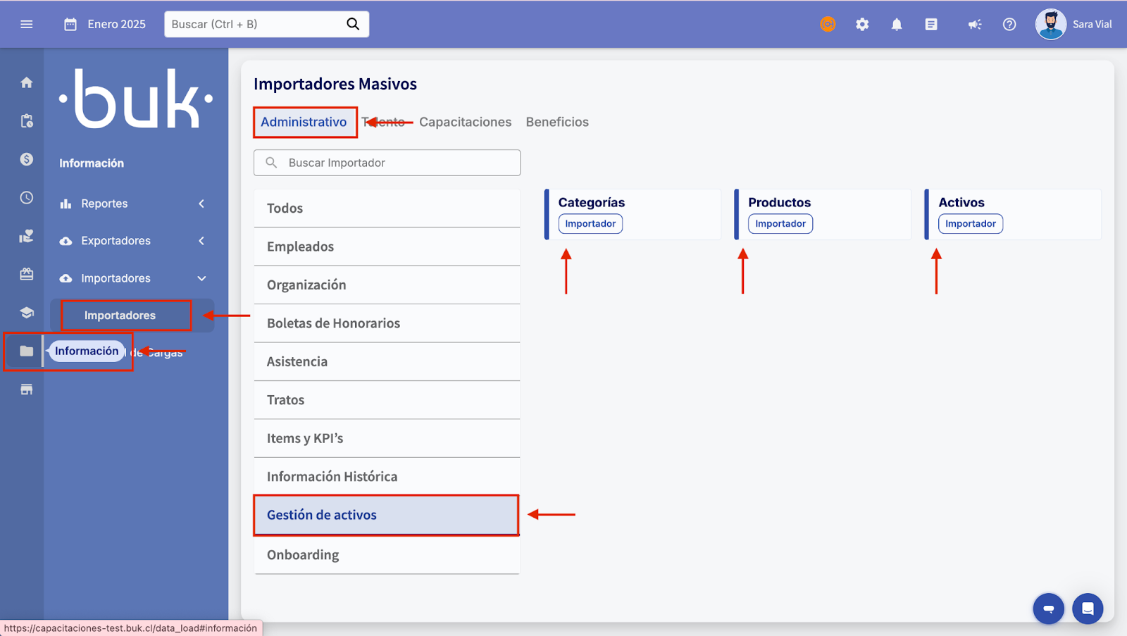 Dentro del menú / Información encontrarás la sección de Importadores, donde podrás descargar los templates para luego importar: