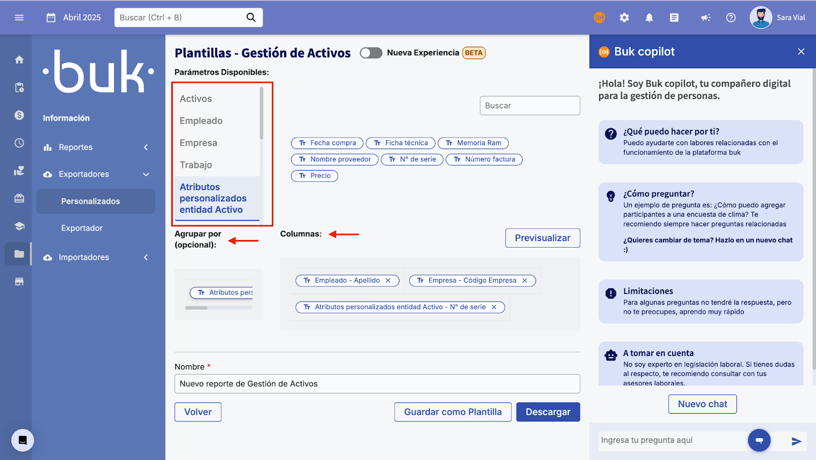 - En esta vista aparecen los parámetros disponibles, de estos se puede elegir agrupar por ciertos parámetros y qué columnas incluir en el exportador.