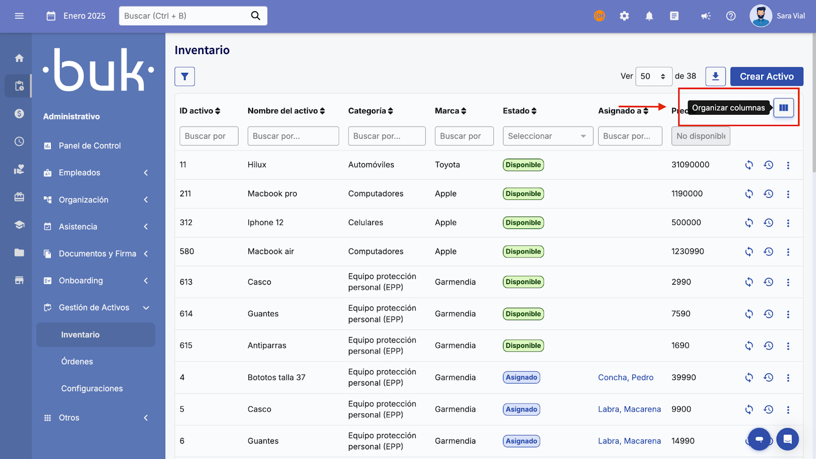 En esta vista, visualizarás la lista de activos que tienes en tu inventario. En caso de querer agregar las columnas que agregaste con tus atributos personalizados, puedes hacerlo haciendo clic en el botón “Organizar columnas” y eligiendo los campos que quieres visualizar.