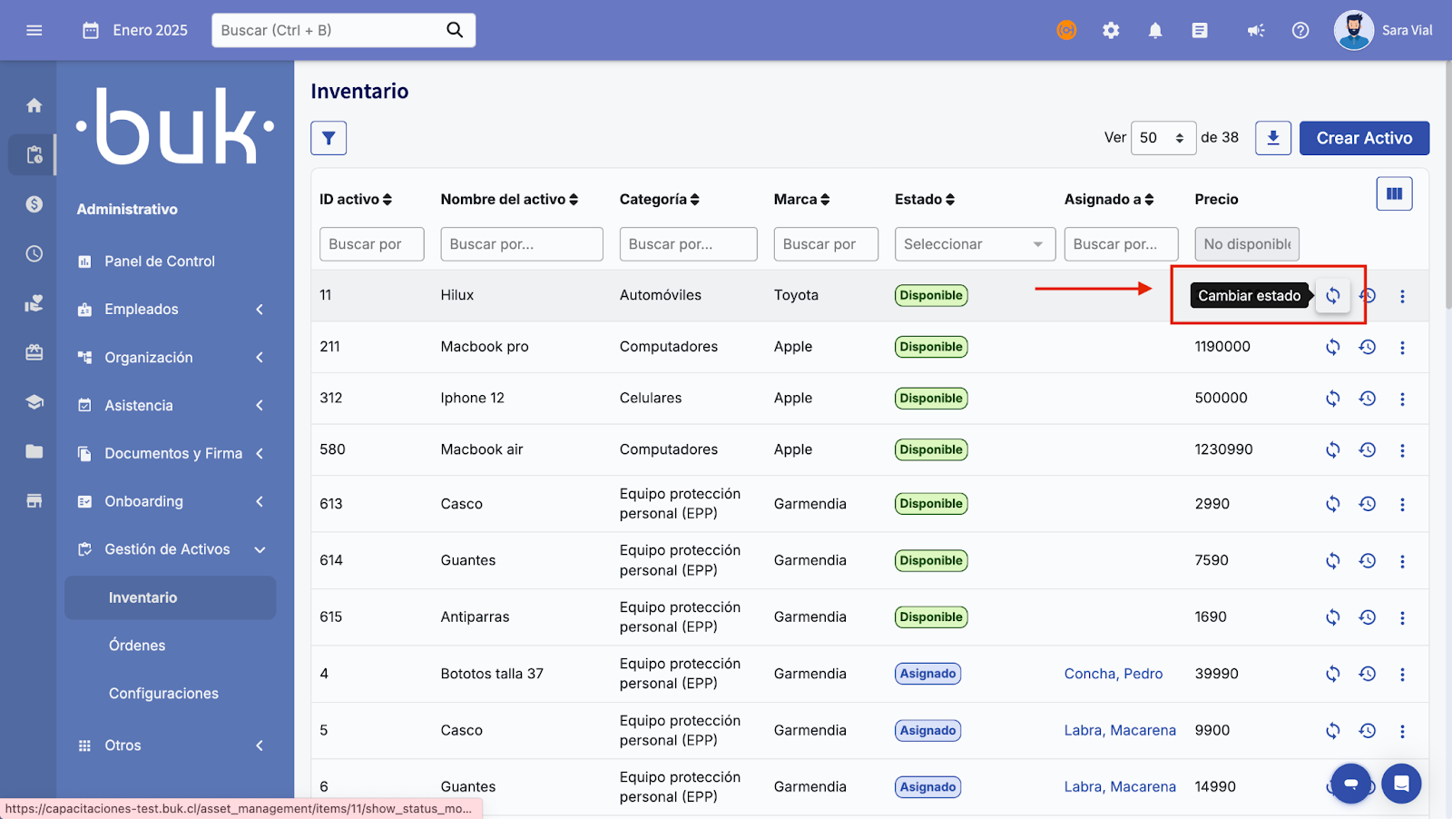- Clic acción “ Cambiar estado” en el listado de los activos